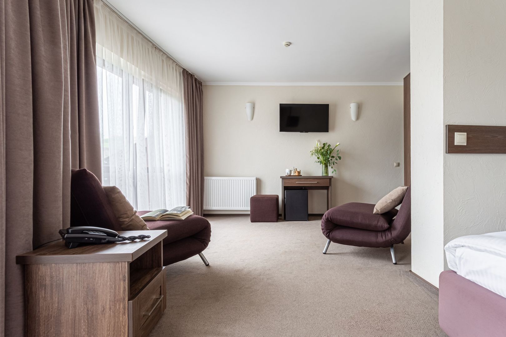Номер включає в себе 1 двоспальне ліжко, 2 односпальні євро-крісла, 2 тумбочки, письмовий стіл і стілець, міні-бар для освіжаючих напоїв, чайник для приготування гарячих напоїв та сейф для безпечного зберігання цінностей гостей.